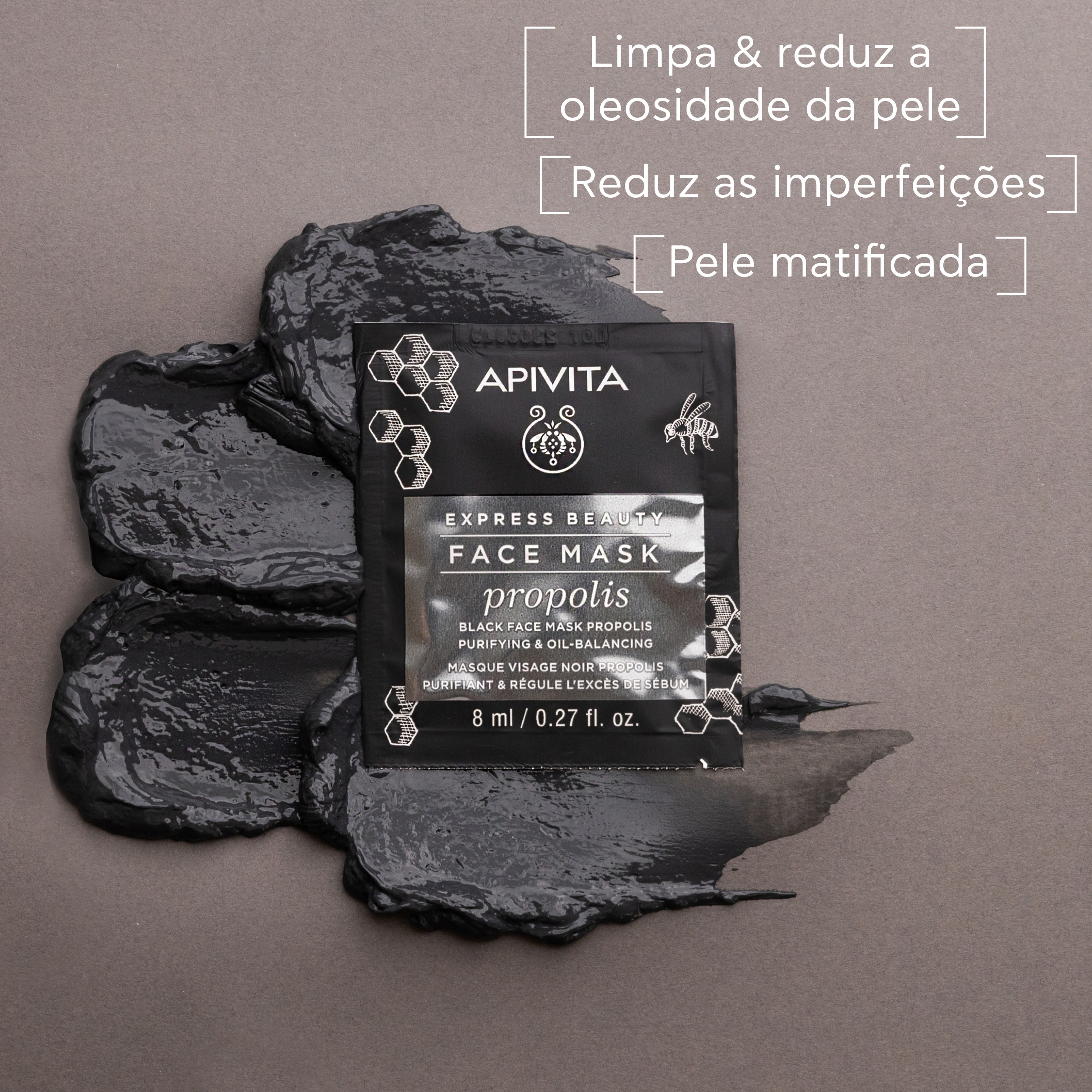 Máscara facial purificante de uso express, com própolis e argila, indicada para pele oleosa ou com tendência a imperfeições. 87% de ingredientes de origem natural