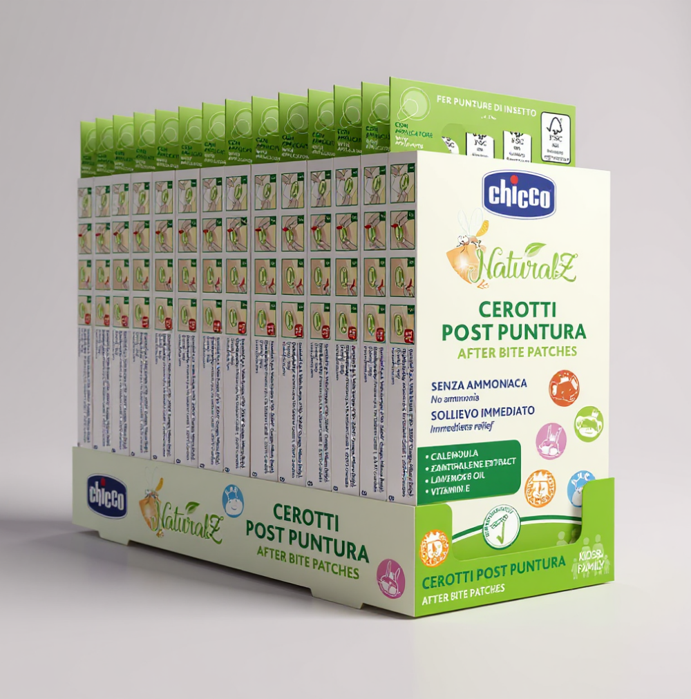 Adesivos calmantes pós‑picada, em formato discreto e prático, enriquecidos com extratos de calendula e zanthalene para aliviar a comichão de picadas de insetos em pele sensível.
