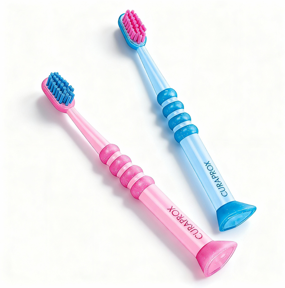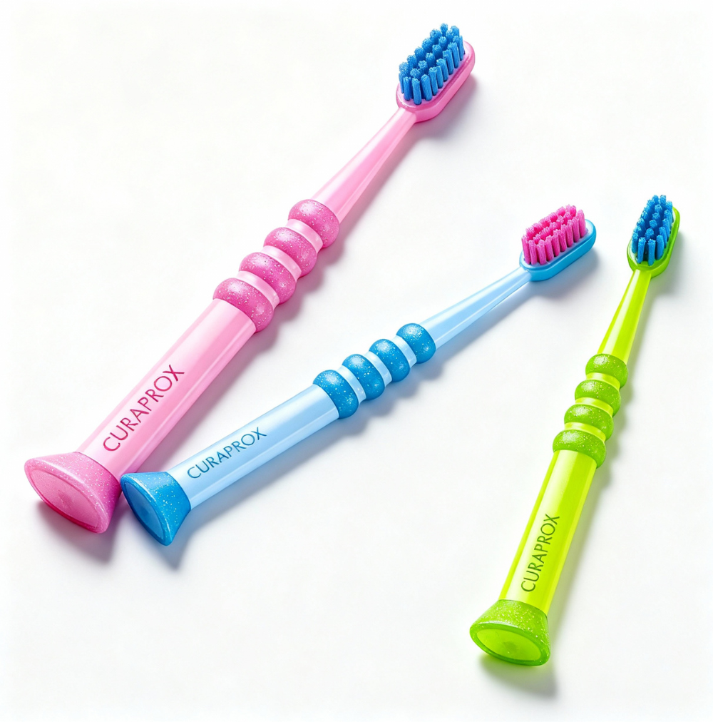 Escova de dentes ultra macia para bebés e crianças até 4 anos, com 4.260 filamentos Curen® ultrafinos e cabo ergonómico com anel de proteção de segurança.