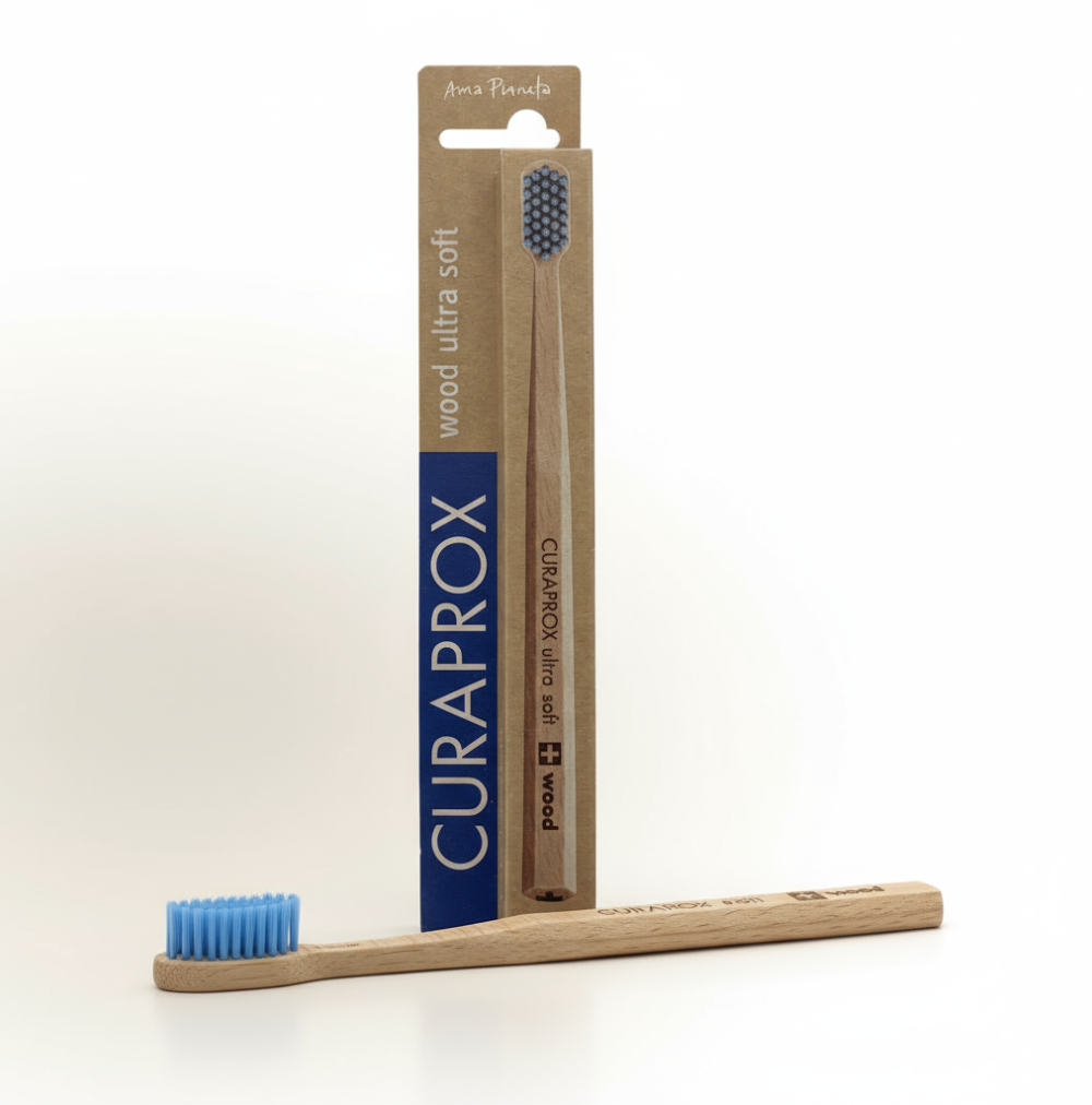 A Curaprox CS Wood Ultra Soft combina o cuidado oral premium com compromisso ecológico. O cabo é feito de madeira de faia suíça proveniente de fontes sustentáveis, tratado com cera de carnaúba para resistir à humidade. A cabeça ultra soft possui 4.440 filamentos Curen® densamente agrupados, cada um com apenas 0,10 mm de diâmetro, para penetração suave entre os dentes, limpeza eficaz da linha gengival e sensação confortável mesmo para quem tem condicionamentos sensíveis. A escova apresenta o design Curacurve® — uma ligeira curvatura que ajuda a alcançar áreas de difícil acesso — tudo isso num produto biodegradável (manche da escova) que alia desempenho e responsabilidade ambiental.