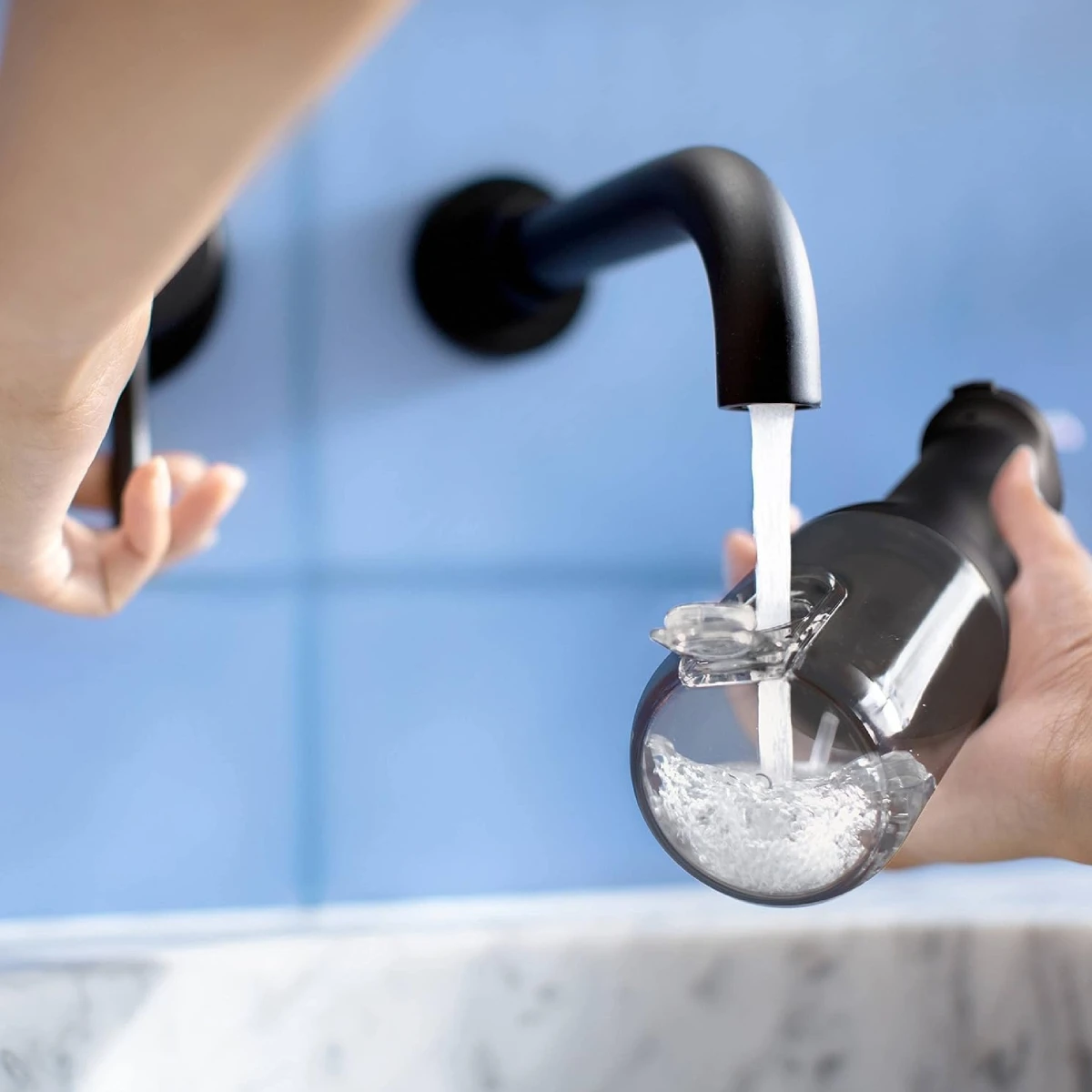 Dispõe de 2 modos de limpeza, 3 níveis de intensidade, boquilha rotativa a 360º e depósito de 250 ml, ideal para a limpeza completa recomendada em apenas 60 segundos. Um irrigador prático, eficiente e fácil de usar no dia a dia.”