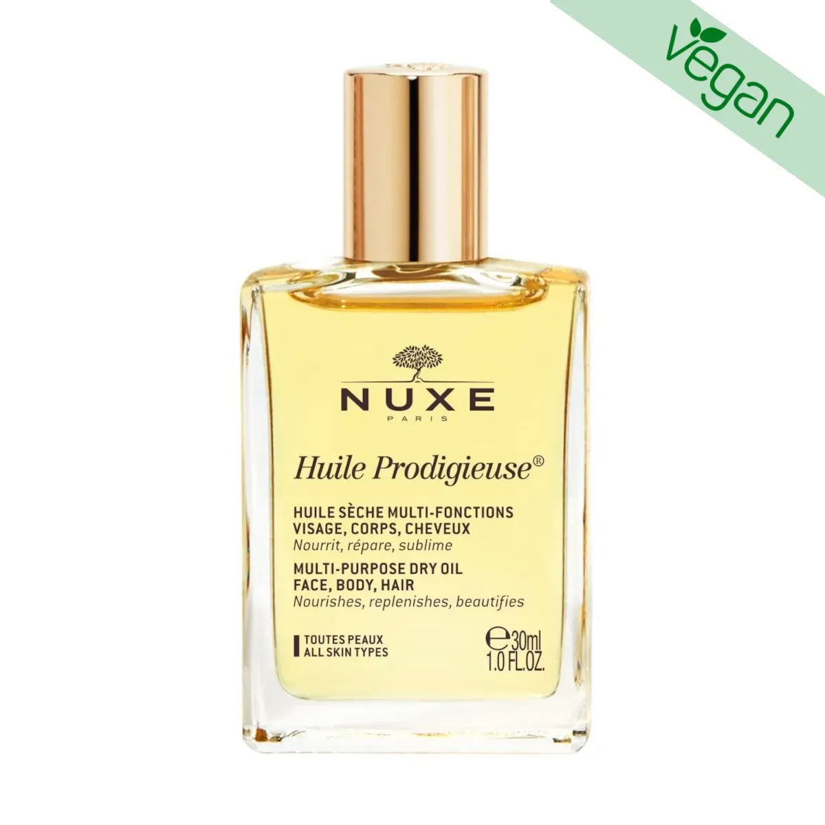 O cuidado mítico da NUXE, um óleo multifunções que nutre, repara e sublima o rosto, corpo e cabelo. Efeito "escudo” contra a poluição: limita a adesão de partículas poluentes. Eficácia antioxidante: 1 gota do Huile Prodigieuse neutraliza mais de 90% dos radicais livres. Eficácia na redução da cor das estrias: -30%. Para todos os tipos de pele.