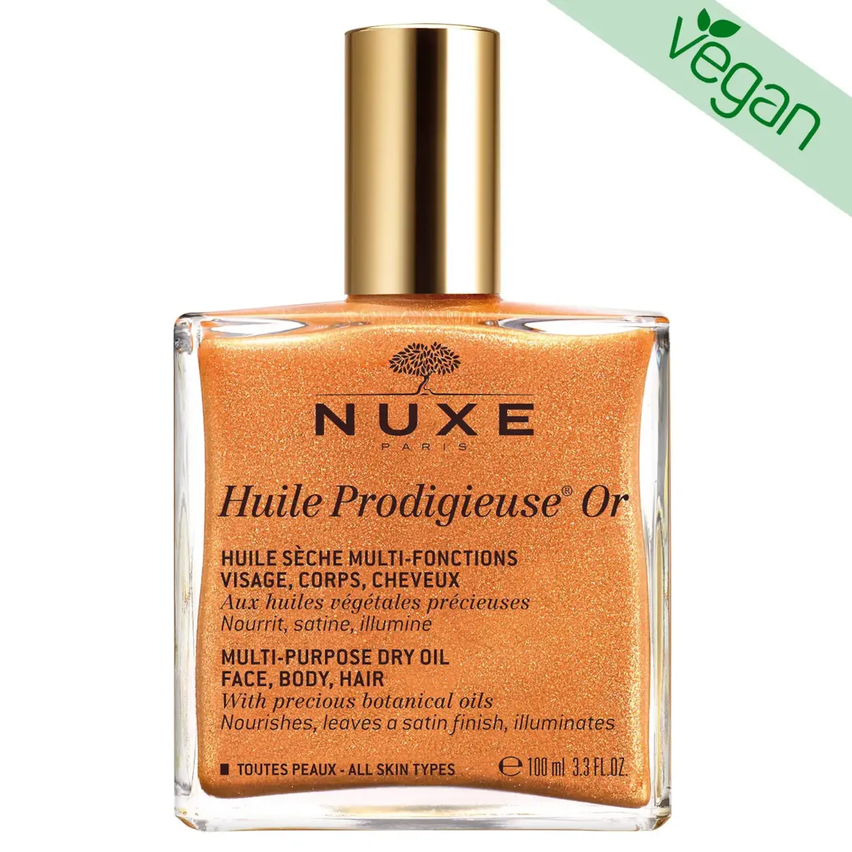 A versão cintilante do icónico óleo seco da Nuxe. Formulado com 7 óleos vegetais preciosos de origem natural, nutre, repara e protege a pele e o cabelo, deixando um acabamento acetinado e luminoso.