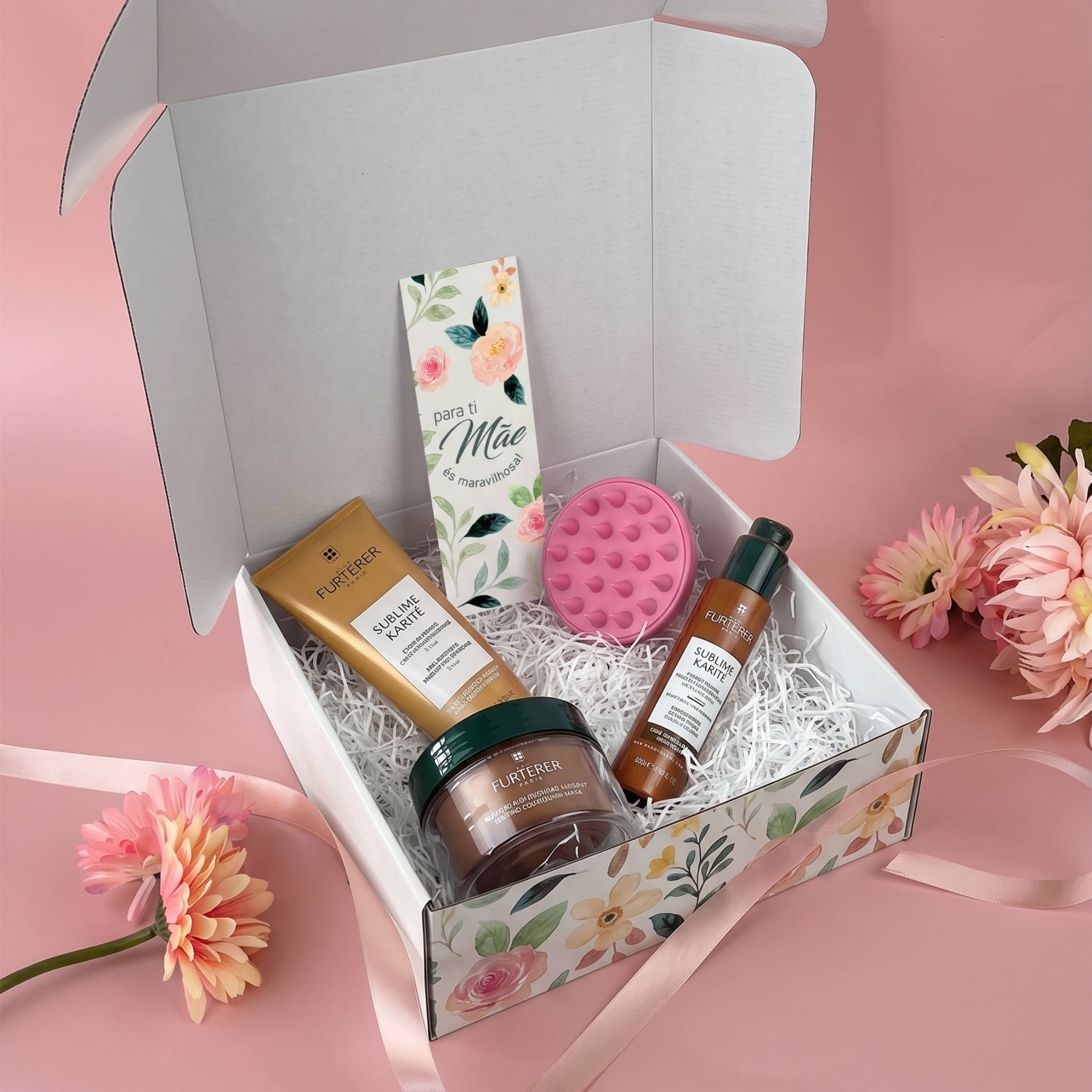 Inclui: René Furterer Sublime Karité Champô (200ml); René Furterer Sublime Karité Máscara Nutritiva (200ml); René Furterer Sublime Karité Creme de Pentear (100ml); Massajador capilar; Caixa presente VWAY