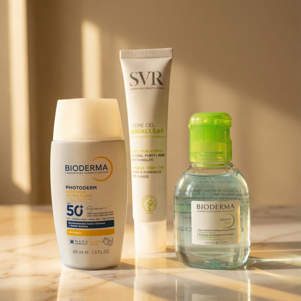 Pensado para quem tem pele oleosa e procura uma rotina simples mas altamente eficaz, este conjunto reúne a Bioderma Sébium Água Micelar 100ml para limpar e purificar suavemente, o SVR Sebiaclear Active Gel Corretor Intensivo 40ml para reduzir imperfeições, controlar brilho e uniformizar, o Bioderma Photoderm X-Defense Ultra-Fluid Invisible SPF50+ 40ml para proteger a pele diariamente dos raios UV e do envelhecimento cutâneo precoce, e uma Necessaire para manter tudo organizado.