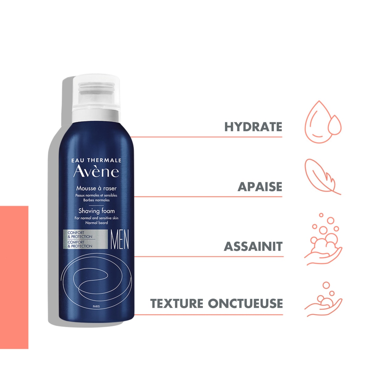 Espuma leve que facilita o deslizar da lâmina, prevenindo irritações e vermelhidão. Enriquecida com Água Termal d’Avène, acalma e protege a pele sensível durante o barbear.