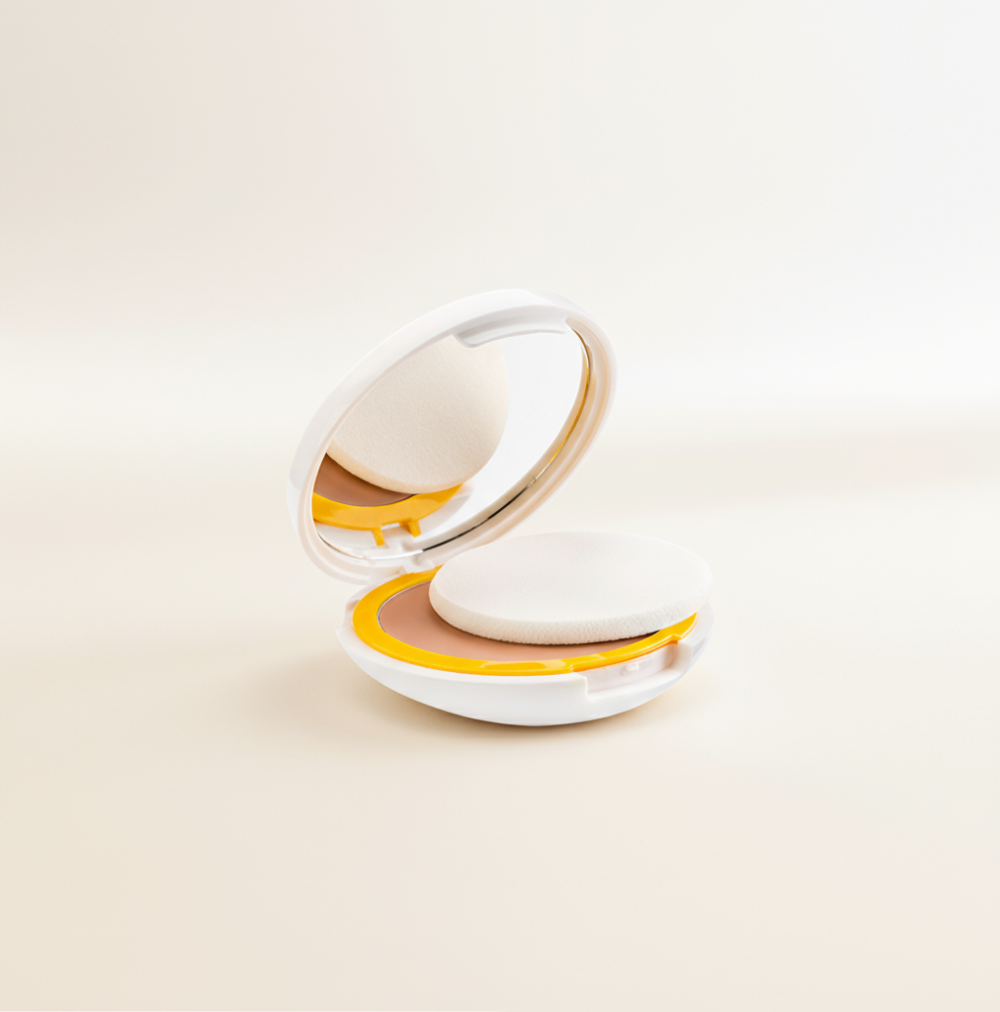 Um protetor solar em pó compacto com cor clara que uniformiza a pele, disfarça imperfeições e oferece proteção mineral muito elevada contra os raios UV.