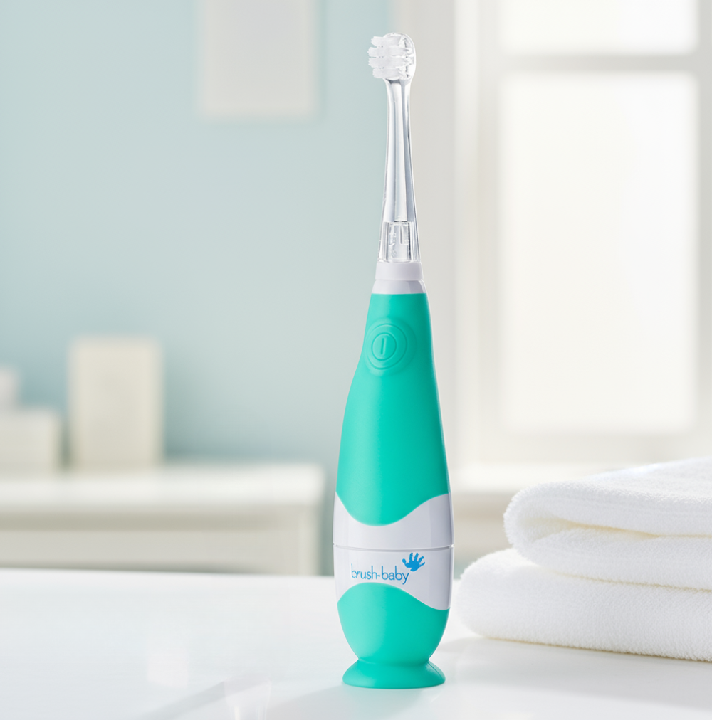 Escova elétrica especialmente criada para bebés e crianças pequenas, com vibração suave e luz LED incorporada.