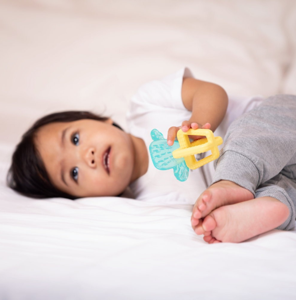 Anel de dentição em forma de cacto, para bebés com 4 meses ou mais, que refresca e alivia as gengivas doloridas — possui textura suave com preenchimento de água e design ergonómico.