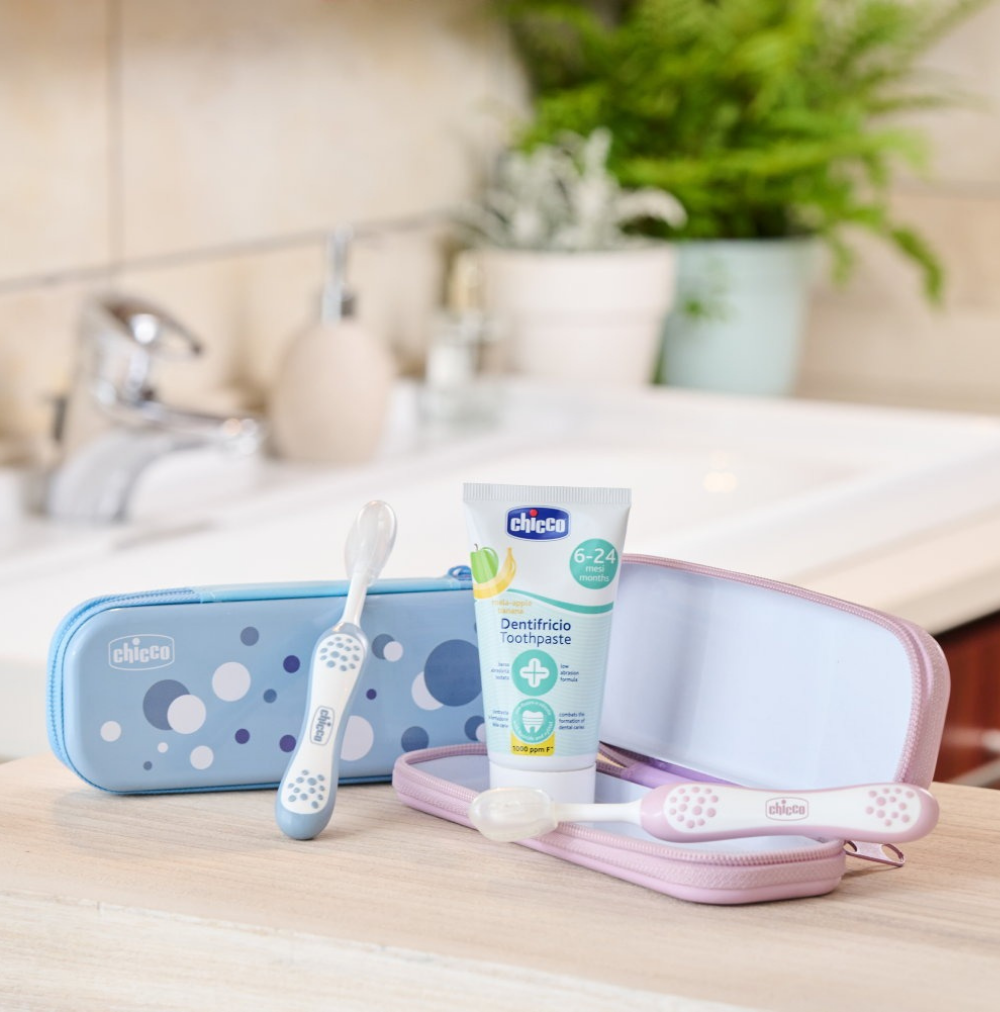 O Chicco Conjunto de Higiene Oral Lilás 6-36 M+ foi pensado para cuidar dos primeiros dentinhos, com componentes cuidadosamente selecionados para a higiene infantil. Inclui: Escova de dentes com cabeça pequena, pescoço fino e cerdas extra suaves com extremidades microfinas—ideal para limpar delicadamente gengivas sensíveis e alcançar cantos difíceis da boca do bebé. Pasta dentífrica sabor maçã e banana (6‑36 M), com formulação de baixa abrasividade, enriquecida com fluoreto de sódio (1000 ppm) e xilitol, que fortalecem o esmalte e previnem cáries. Estojo azul com fecho, resistente e compacto, facilita o transporte e armazenamento dos itens, mantendo-os higiénicos.