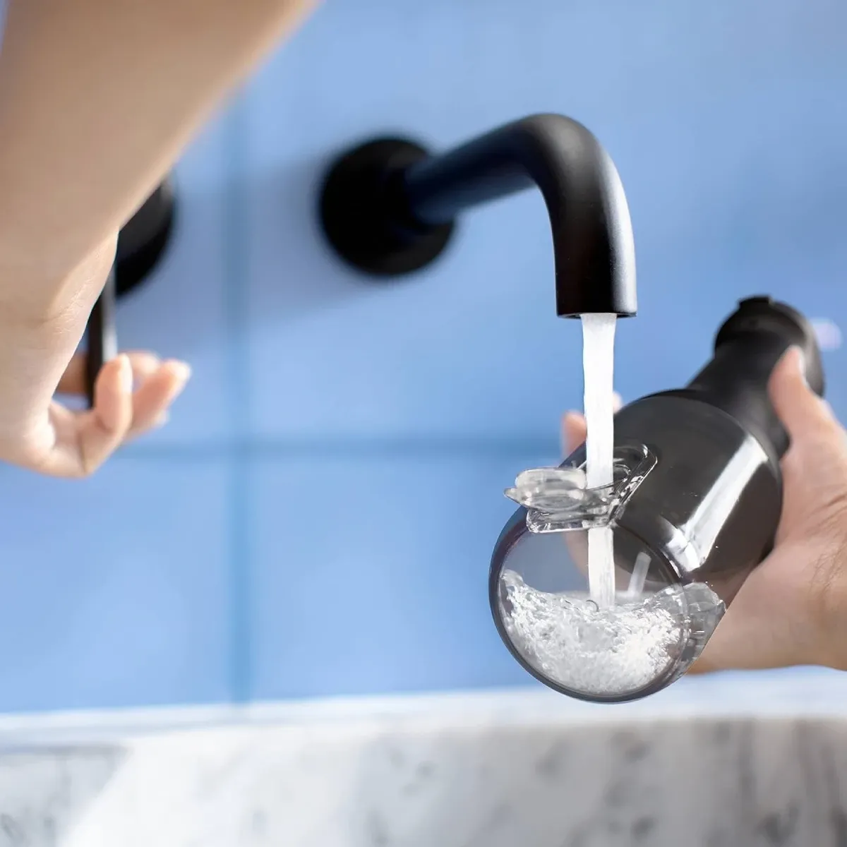 Irrigador oral com tecnologia Quad Stream para uma limpeza profunda e eficaz em apenas 60 segundos.