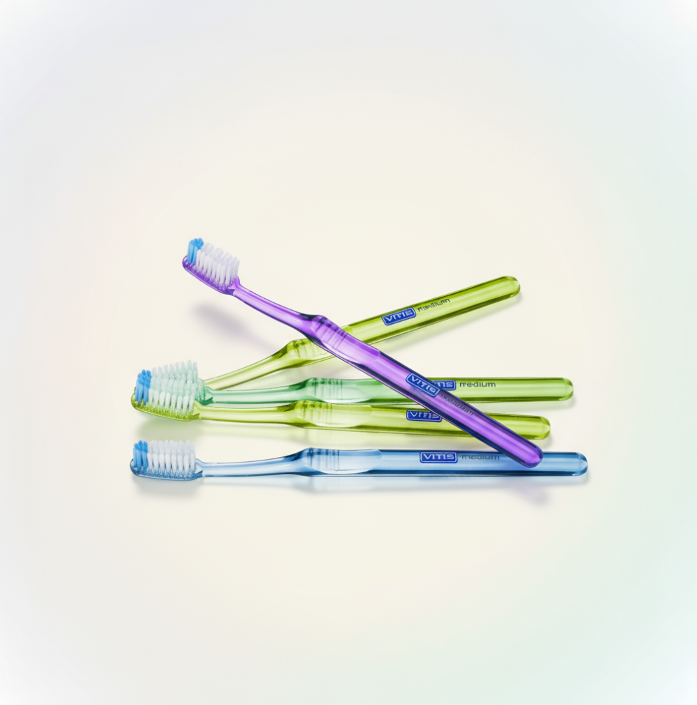 Vitis Escova de Dentes Média foi desenvolvida para remover o biofilme oral (placa dentária) formado nos dentes. É uma escova de dentes para utilização diária, com a cabeça em forma de diamante, permitindo alcançar as zonas de mais difícil acesso da cavidade oral. Os seus filamentos de dureza média e de perfil ondulado alcançam os espaços interdentários e facilitam a limpeza no contorno das gengivas. Apresenta um pescoço flexível, que dobra, adquirindo uma posição adequada à sua boca melhorando, assim, a acessibilidade durante a escovagem. Cabo anatómico e com estrias antideslizamento para facilitar a utilização e o conforto durante a escovagem. Esta escova incorpora uma tampa protetora que mantém os filamentos agrupados e em condições ótimas de higiene, permitindo uma rápida secagem.