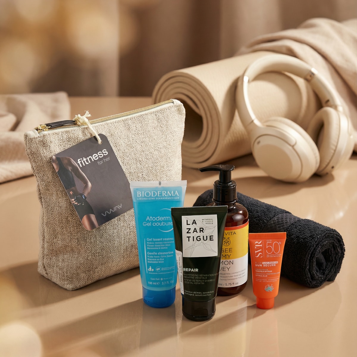Pensado para mulheres ativas que valorizam uma rotina de cuidado prática e eficaz, este conjunto reúne o Bioderma Atoderm Óleo de Banho 100ml, que limpa e nutre profundamente a pele após o treino, o Lazartigue Repair Champô 50ml, ideal para reparar e fortalecer o cabelo exposto ao suor e lavagens frequentes, e o Apivita Bee My Honey Leite Hidratante Corporal 200ml, que hidrata e suaviza com uma fragrância delicada.